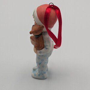 Hallmark Keepsake Grandson ornament from 2000, fine porcelain design featuring a boy in pajamas wearing a Santa hat holding a puppy. This pre-owned ornament is in excellent condition, with the original box showing wear due to age and storage and a numbered sticker on the top.