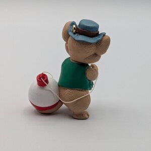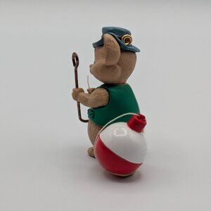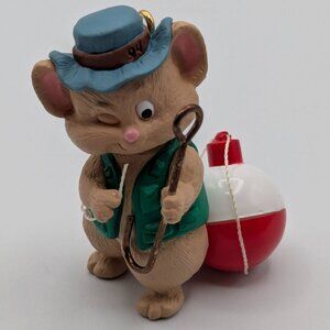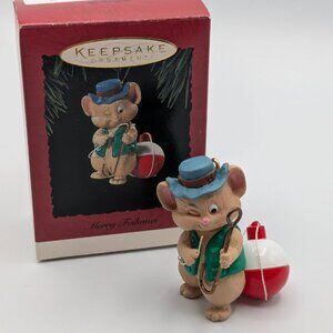 This 1994 Hallmark Keepsake ornament, Merry Fishmas, is a handcrafted design featuring a festive mouse reeling in holiday cheer. The box includes the quote: "No wishing for this mouse, his 'catch' won't get away, he's fishing for some yuletide fun, a 'keeper' holiday." Ornament is pre-owned and in excellent condition. Original box shows minor wear due to age and has a numbered sticker on the top.