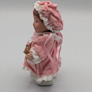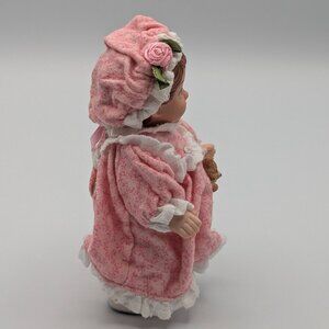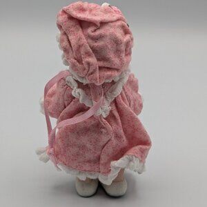 Hallmark Keepsake Mistletoe Miss ornament from 2001 is the 1st in the Mistletoe Miss Series. This porcelain ornament features Mistletoe Miss in real fabric clothing, wearing her nighttime cap and gown with a porcelain teddy bear tucked in her pocket. She has jointed arms and legs, adding charm and detail to the design. The ornament is in excellent condition. The original box shows minor wear due to age and has a numbered sticker on the top.