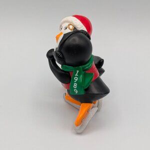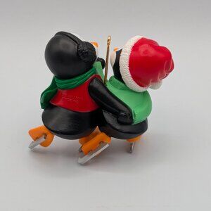 Hallmark Keepsake Mom and Dad ornament from 1989, handcrafted and featuring two penguins dressed in sweaters ice skating together. Pre-owned and in excellent condition. The box shows wear due to age and has a numbered sticker on the top.