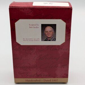 This 1997 Hallmark Keepsake ornament, Mom and Dad, is a handcrafted design featuring a dad mouse carrying a stack of gifts with mom mouse perched on top, capturing a sweet holiday moment. Ornament is in excellent condition and pre-owned. Original box is included and shows wear due to age. It also has a numbered sticker on top.