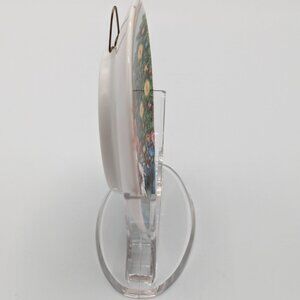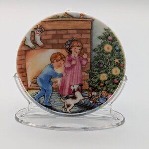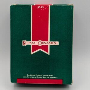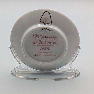 Hallmark Keepsake Morning of Wonder miniature porcelain plate ornament from 1989, third in the series, and includes a plate stand. Pre-owned, the ornament is in excellent condition while the box shows wear due to age and storage and has a numbered sticker on top.