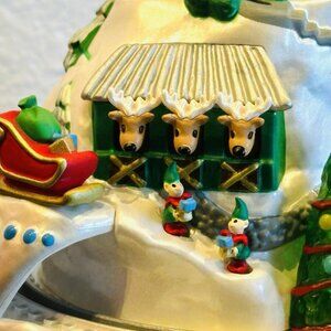 Hallmark Keepsake ornament: North Pole Village 2021. Press the button on the ornament to see it illuminate, hear Santa's voice and music from "Santa Claus is Coming to Town", and see the elves getting ready for Christmas. The ornament runs on three AAA batteries, which are not included.