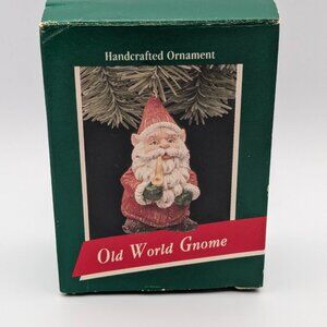 This vintage 1989 Hallmark Keepsake "Old World Gnome" handcrafted ornament features a charming gnome with intricate details, perfect for any holiday tree. Pre-owned in excellent condition, it’s a delightful piece for collectors. The original box is included and shows wear due to age, adding to its vintage appeal.