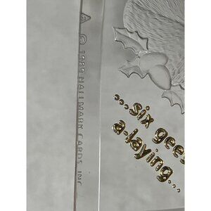 This Hallmark Keepsake Ornament from 1989 features a heart-shaped acrylic design with six geese a-laying, part of The Twelve Days of Christmas series. It is a collector's item with intricate etching and gold accents, suitable for holiday decor or as a timeless gift.