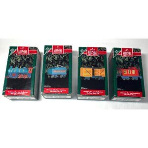 The 1992 Hallmark Keepsake Ornament Christmas Sky Line Train Collection Set includes four intricately designed ornaments. Featuring a blue locomotive, coal car, stack car, and red caboose, each piece is crafted to represent a classic train set. The vibrant colors and detailed design make this set a collectible treasure.