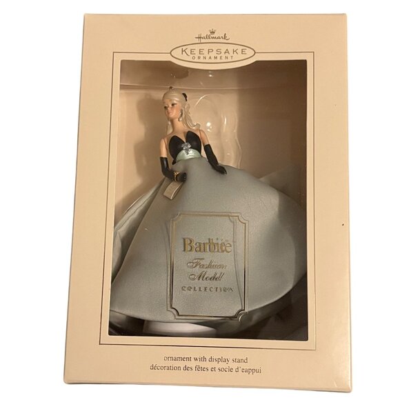 Elegant collectible ornament featuring Barbie in a refined gown with a display stand, handcrafted with care for timeless charm.