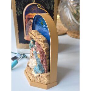 This 1996 Hallmark Keepsake ornament features a detailed nativity scene with a light-up design, enhancing holiday décor with warm, festive charm. Would look so beautiful on your Christmas tree