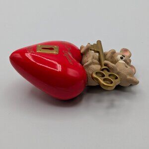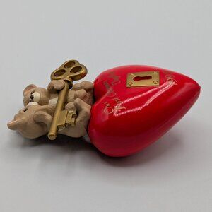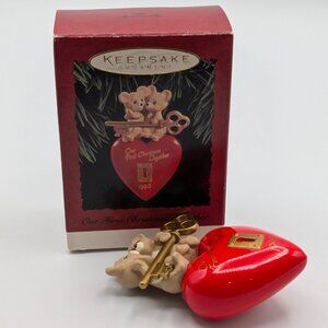 Hallmark Keepsake “Our First Christmas Together” ornament from 1995 featuring two bears with a heart and key. Pre-owned; ornament is in excellent condition, and the box shows wear from age and storage.