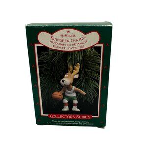 This Hallmark Keepsake ornament features Prancer from the Reindeer Champs series, dated 1988. The handcrafted design highlights Prancer's basketball skills, making it a unique addition to holiday collections.