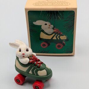 Hallmark Keepsake “Roller Skating Rabbit” ornament from 1984. Pre-owned; ornament is in excellent condition, and the box shows wear from age and storage.