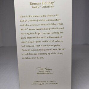 Rare find: This item is hard to come by. Hallmark Keepsake Roman holiday Barbie ornament. #14 in the series. Dated 2007 in original box. Mint condition. A great gift for someone planning a trip to Rome or a Barbie ornament collector. Size 4.5 inches. Non smoking pet free home.