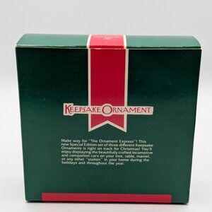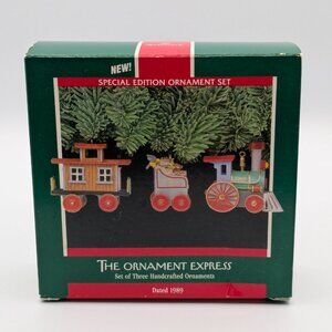 This 1989 Hallmark Keepsake ornament set, The Ornament Express, includes three handcrafted ornaments: a locomotive, companion car, and caboose. This special edition set can be hung on the tree or displayed on a mantle for festive charm. Ornaments are pre-owned and in excellent condition. Original box shows wear due to age.
