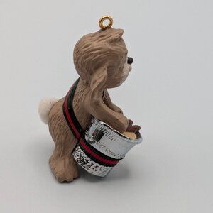 Hallmark Keepsake “Thimble Drummer” ornament from 1987, tenth in the Thimble Series, featuring a bunny playing the drum. Handcrafted and pre-owned; ornament is in excellent condition, and the box shows wear from age and storage.