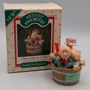 Celebrate childhood memories with this Hallmark Keepsake "Three Men in a Tub" Handcrafted Ornament from 1987. Sculpted by the talented Donna Lee, this piece is part of the cherished Artists' Favorites collection, highlighting beloved nursery rhymes. Despite being used, the ornament is in excellent condition, with the original box showing some wear due to age.