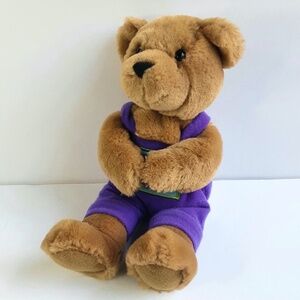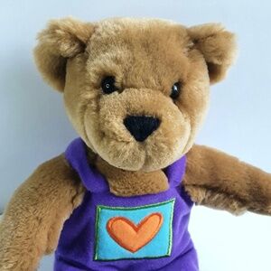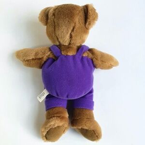 Adorable 10" plush Teddy Bear by Hallmark. Part of the Kissing Bears with a magnetic nose and velcro patch on its right hand. Even without a partner, this teddy bear will charm you in its purple overalls with bright orange heart. With the plastic pellets in its tushy, it sits nicely in a chair or on a shelf. The velcro patch holds his hands together for a cute little pose.