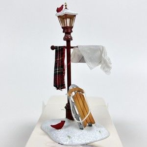 -Someone has left their sled and scarf next to the lamppost sign, 2 little red cardinals guarding them.