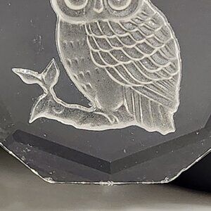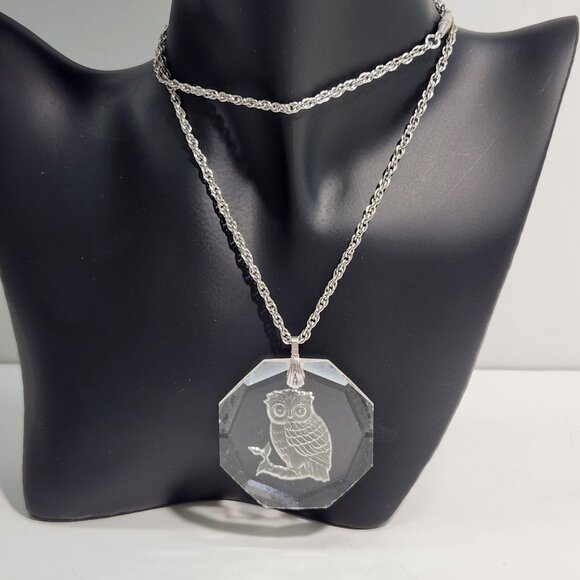 Hallmark Little Gallery reverse etched owl sitting on a branch. 22" silver tone chain with barrel screw clasp, Hallmark tag on chain. Medallion 1 3/4" in diameter. Small chips on edges on bottom. See last photo.