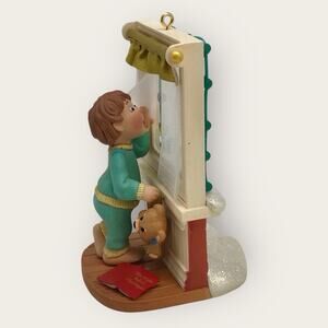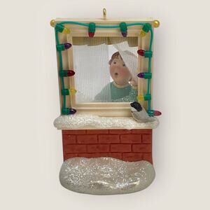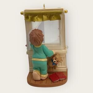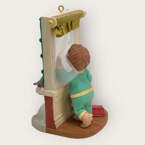 This 2006 Hallmark Keepsake Christmas Ornament features a little boy gazing out of a window trimmed in Christmas lights. Sparkling snow outside.