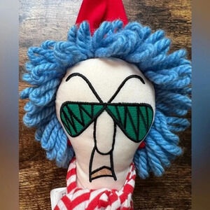 Hallmark Maxine Christmas jungle bell door hanger. Funny Maxine character. You hang it over the door knob and the bells jingle when you open/close the door. Length: 24”. Maxine’s face has a Sabra hat on and blue yarn hair. Her scarf is red and white stripe with 3 gold jingle bells and green yarn fringe on bottom. Very cute, fun for the Maxine lover.