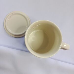 2 piece set includes ceramic mug and lid that can be used as coaster. blue and cream color.