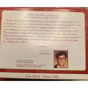 This Hallmark Ornament from the year 2000 features a 1924 Toledo Fire Engine #6, beautifully crafted from cast metal. The ornament is part of the Ornaments collection and is perfect for those who love fire-themed decorations. It is colored with a vibrant multicolor design and has a metallic finish.