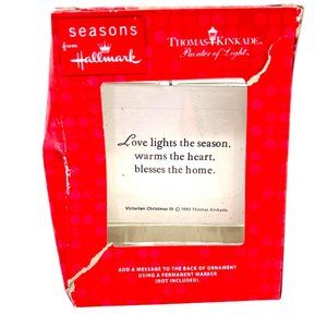This Hallmark Ornament from 1993 is a must-have for any Thomas Kinkade collector. Featuring a home lit up with a 3D Christmas tree and snowman in front. The saying on the back reads, "Love lights the season, warms the heart, blesses the home." Celebrate the season with this notable Painter of Light ornament.