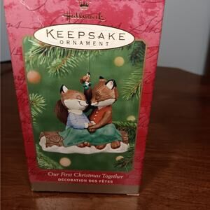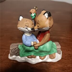 This is a First Christmas together ornament in excellent condition. It is dated 2001. It depicts 2 foxes sitting on a log. The male fox is holding a mistletoe over their heads. Very Cute! The box is in very good condition other than where a sticker was peeled off.