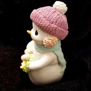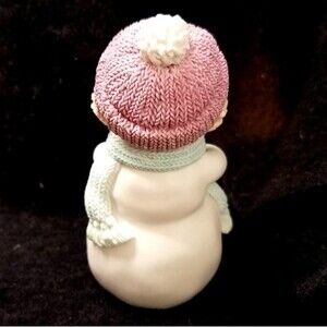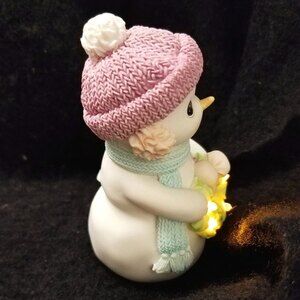 Cute ceramic snowman with adorable pink hat and lighted wreath wishing Merry Christmas.