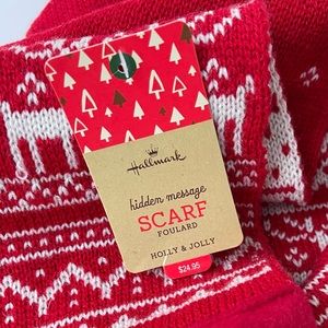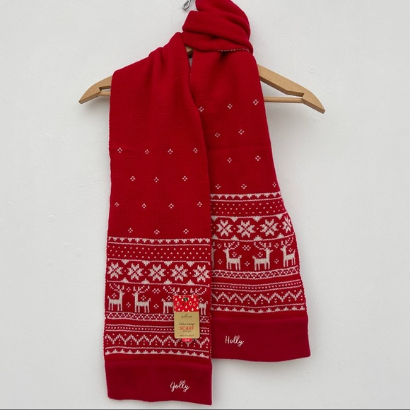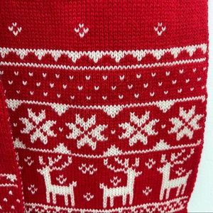 Cozy red scarf with festive white patterns. Perfect for winter warmth.