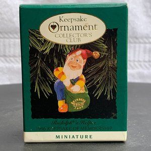Rudolph's Helper, Club - Hallmark Miniature Keepsake Christmas Ornament from 1996 With Original Box, This 1996 Hallmark Keepsake Miniature ornament shows a little elf with a bag of "Reindeer Treats". This item was originally a Keepsake of Membership for the Hallmark Keepsake Ornament club in 1996. The reindeer treat bag is dated "1996"