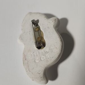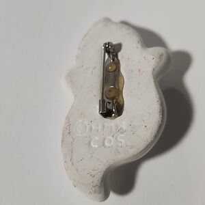 Adorable ghost brooch featuring a cheerful smile and an orange bow. Perfect for adding a playful touch to any outfit.