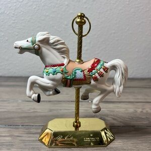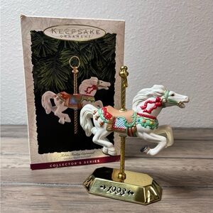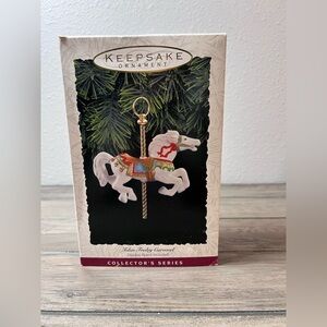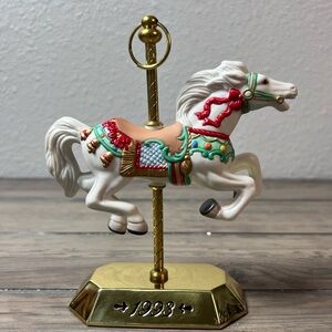 This Vintage 1993 Hallmark Keepsake Christmas Ornament is the 2nd in the Tobin Farley Carousel Series. This Collectible Ornament can be displayed on your tree or on the removable stand. This beautiful Carousel is made of Fine Procelain and Brass stand. The Ornament is in perfect condition.