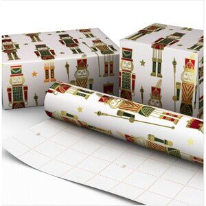 Add a touch of traditional style to your holiday presents with this metalized paper. Christmas wrapping paper features gold stars and rows of nutcrackers on a cream background and a metallic finish.
