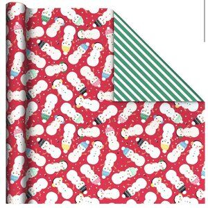 • Heavyweight reversible holiday wrapping paper with green and white stripes on one side and red with cute snowmen on the other.