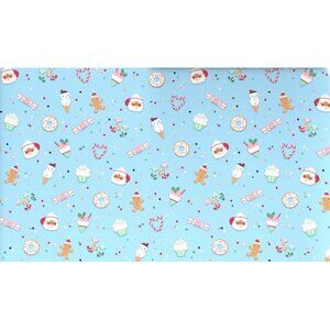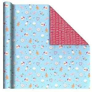 • Heavyweight reversible holiday wrapping paper with sweet treats on mint blue on one side and white loops on red on the other.