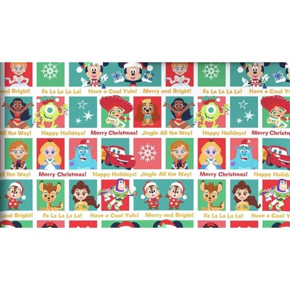 • Heavyweight Christmas wrapping paper with favorite Disney and Pixar characters on colorful backgrounds.