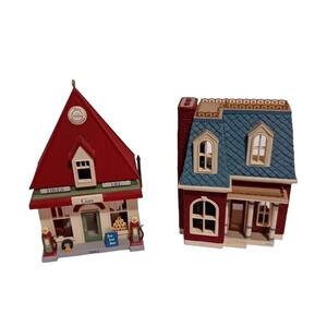 Hallmark keepsake set of 2 ornaments nostalgic houses and shops 1999 and 2001 services station in excellent condition from smoke and pet free home.0614