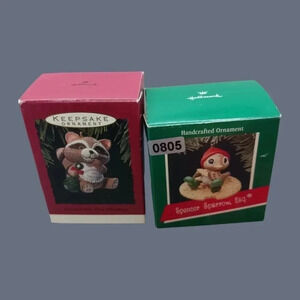 Hallmark vtg animals ornaments includes 2 pinguins,spencer sparrow esq,christmas owl,red hot holiday fire fighter polar bear,grandchild first christmas racoon,thimble puppy