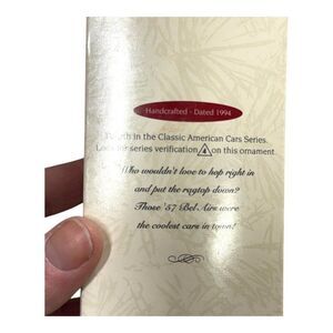 This Hallmark Keepsake ornament showcases the iconic 1957 Chevrolet Bel Air, beautifully detailed and boxed for collectors. A timeless addition to any holiday décor.