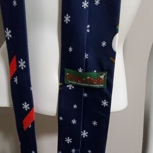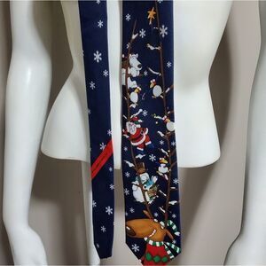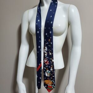 Hallmark Polar Pals blue polyester Christmas tie with a reindeer, snowman, Santa, penguins, and a polar bear on it.