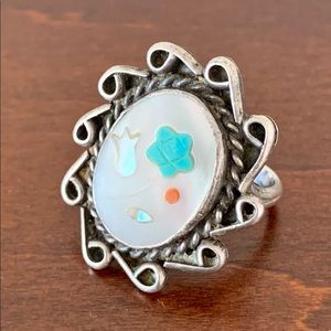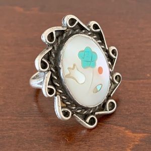 Gorgeous vintage sterling silver Zuni ring with mother of pearl, turquoise, and coral inlay in the design of a flower. The inlay is in very good shape and has no apparent cracks or chips. The band is somewhat flattened in back, which might be intentional to keep it from spinning (it’s a trick I sometimes use on some of my big rings). It is hallmarked but I don’t readily recognize the maker’s mark (see photos). This is a real beauty!