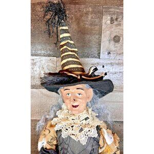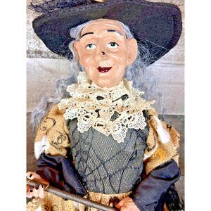 Halloween 27" Witch Doll Shelf Sitter Country Burlap Lace Ghost Pumpkin EUC MADE BY BROOMSTICK. Displayed only. Black Spider lace Dress with Burlap that has ghost and pumkins on it. Lace Trim. Excellent condition with small nick under chin. Detail pictures are attached. Sold as is as pictured in the listing.
