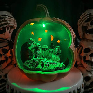 Halloween 7" Color Changing Spooky Skeleton Graveyard Scene Spiderweb Pumpkin