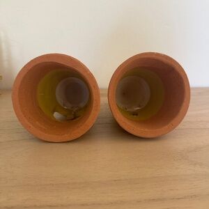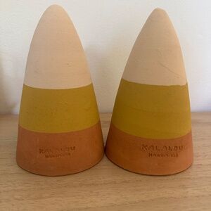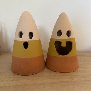 This set of adorable candy corn / pumpkin clay/ceramic candle covers are so unique and cute. Approximately 9” tall. Come as a set. No scratches or cracks. Place a candle under them for a jack - o - lantern type feel or just use as decor without illuminating them. Either way, they will become a favorite!