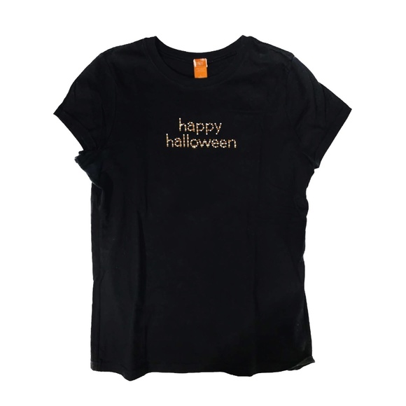 Black women's cut t-shirt with "happy halloween" bedazzling. Size L Armpit to armpit measurement: 21 inches Total length: 27 inches
