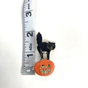 brooch, enamel pin, lapel pin, black, orange, gold tone, green eyes, cat design, pumpkin motif, Halloween theme, spooky, festive accessory, metal alloy, glossy finish, lightweight, novelty jewelry, fun statement piece, cute and quirky, autumn fashion, fall season, trendy, collectible, gift for her, party wear, seasonal style, whimsical, charming