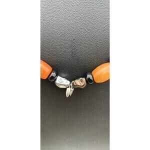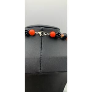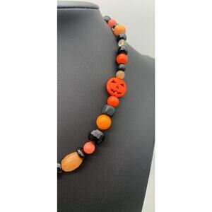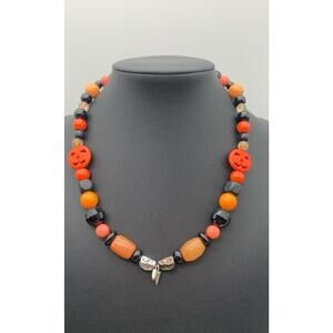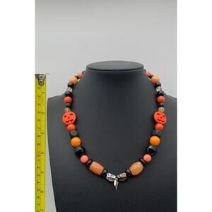 This Halloween-themed necklace features a beaded design with black and orange colors, perfect for adding a spooky touch to your outfit. The necklace is adorned with jack-o-lantern and skull motifs, adding a fun and playful element to your Halloween ensemble. At 15 inches in length, this necklace is a statement piece that will stand out and perfectly capture the Halloween spirit.