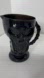 shiny, black, has bones-shaped handle, 8” Tall, 4.5” Diameter base 5.5” Diameter top, holds 6 cups liquid, 48 ounce. No microwave, no dishwasher, wash before first use, no hot liquids.