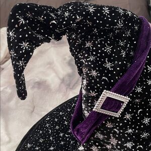 Enchanting black and purple witch hat with a sparkling design. Perfect for adding a magical touch to any outfit.